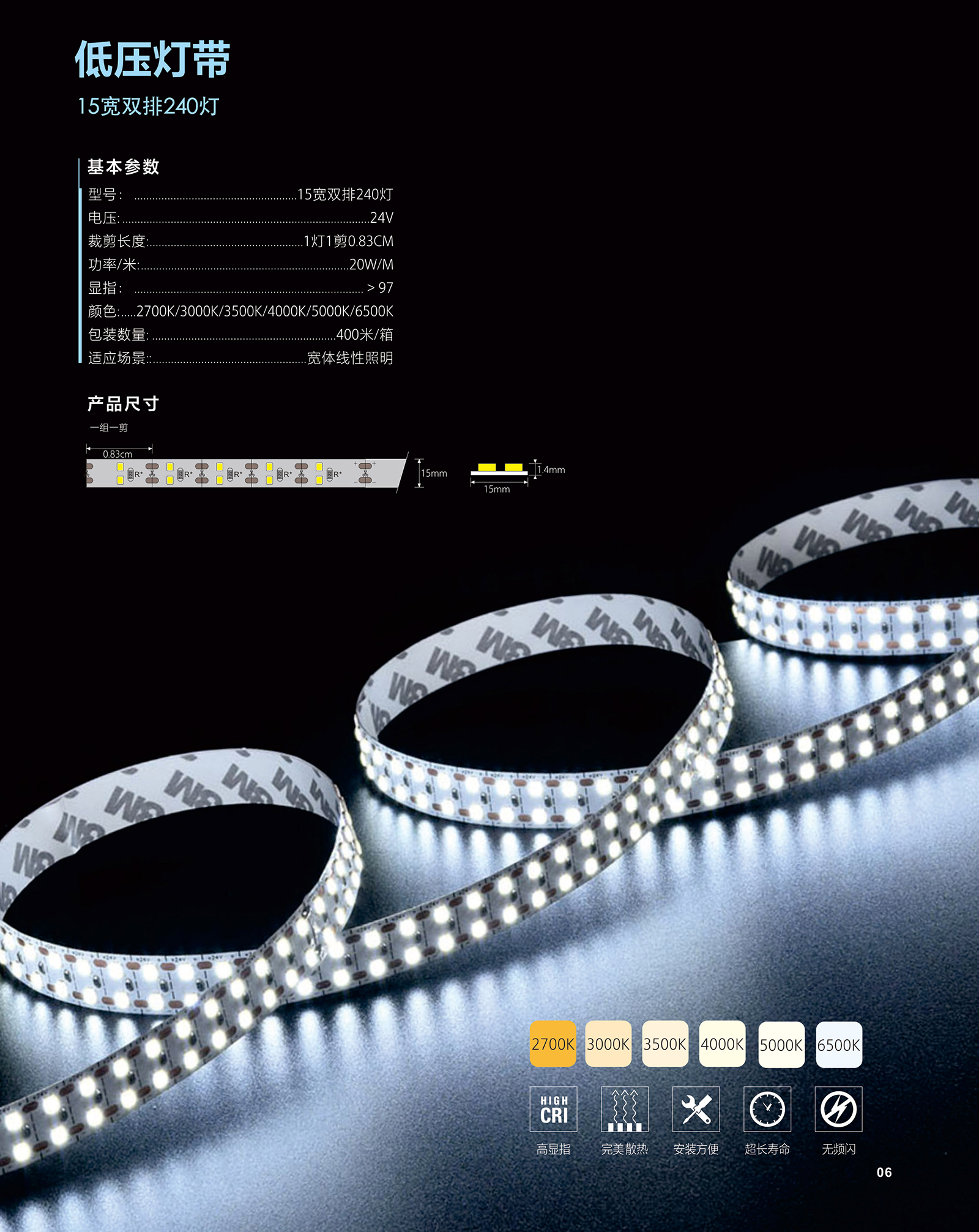 本系列灯带采用先进的2835灯珠,每米达120颗,光效高达400流明,显色指数高达Ra>97,呈现非凡亮度与真实色彩。色彩纯净通透,细节自然还原,赋予空间前所未有的生动表现力,让每一处色彩尽显本真之美。