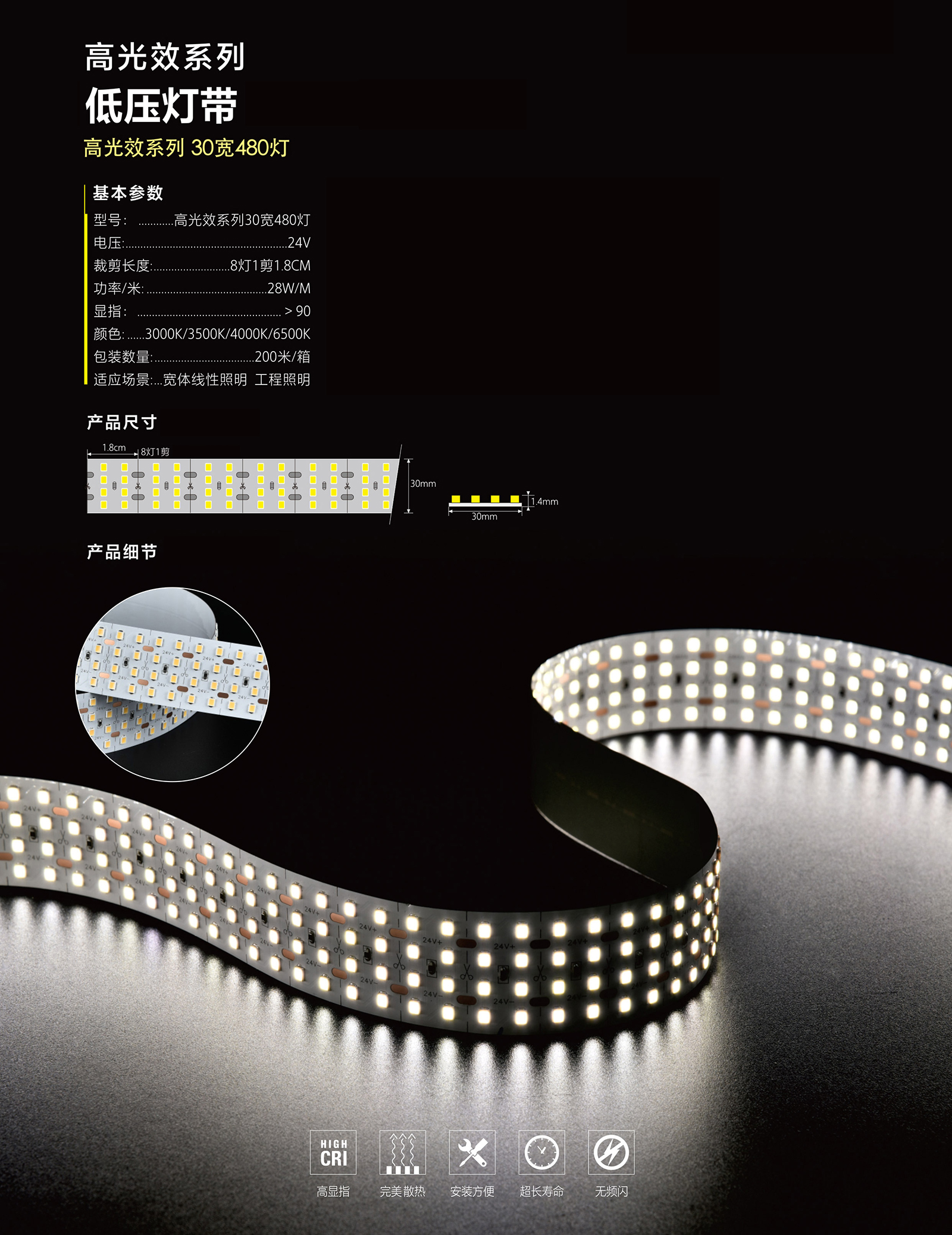 争渡照明采用创新型 2835 480LED 灯珠,光效高达 28W/M。凭借 Ra>90 的卓越显色指数,呈现非凡的亮度和逼真的色彩。
