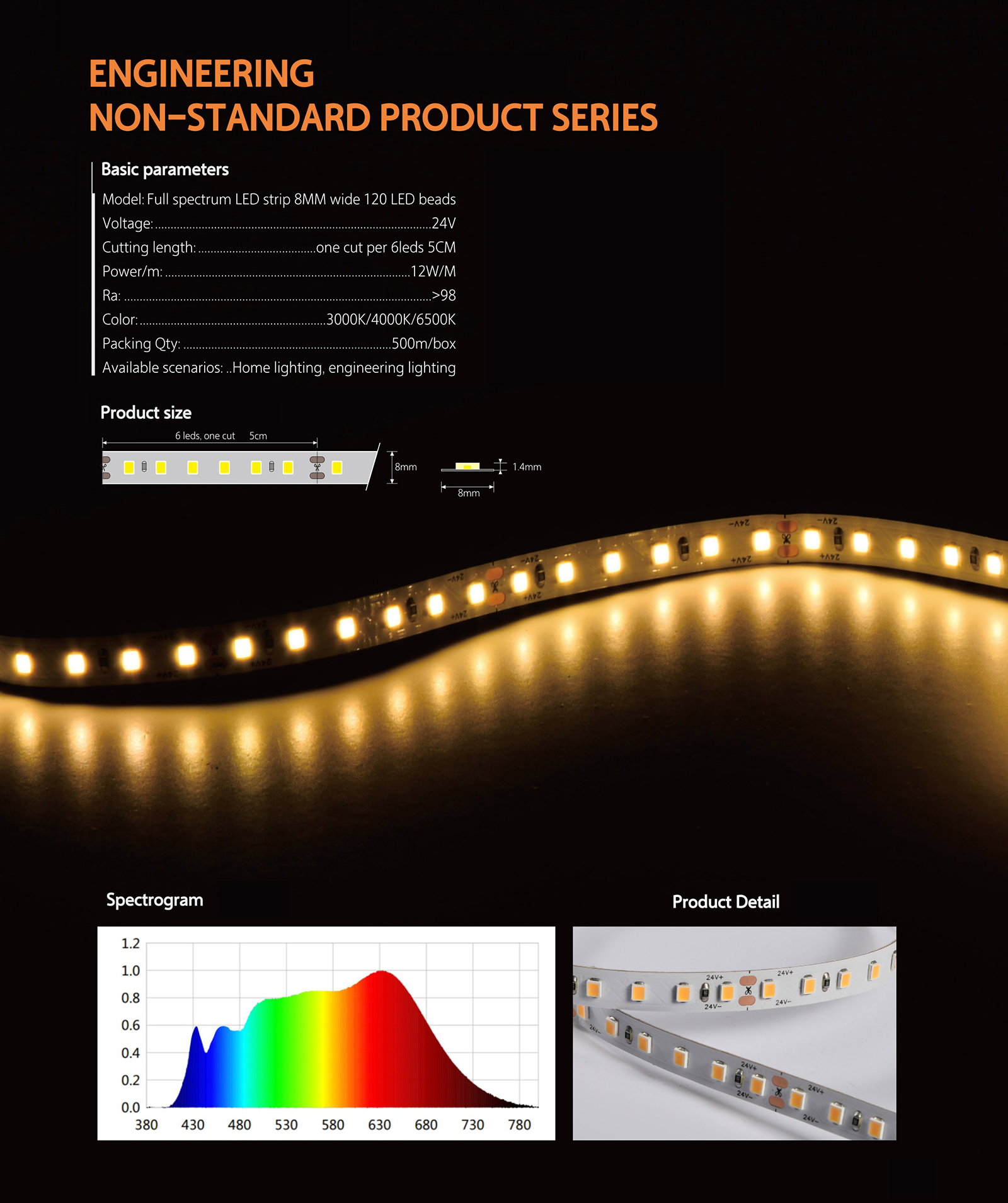 | Model NO. | ZD2835-120P-24V-8MM full spectrum | Emitting Color | Warm White/Nature White/White |