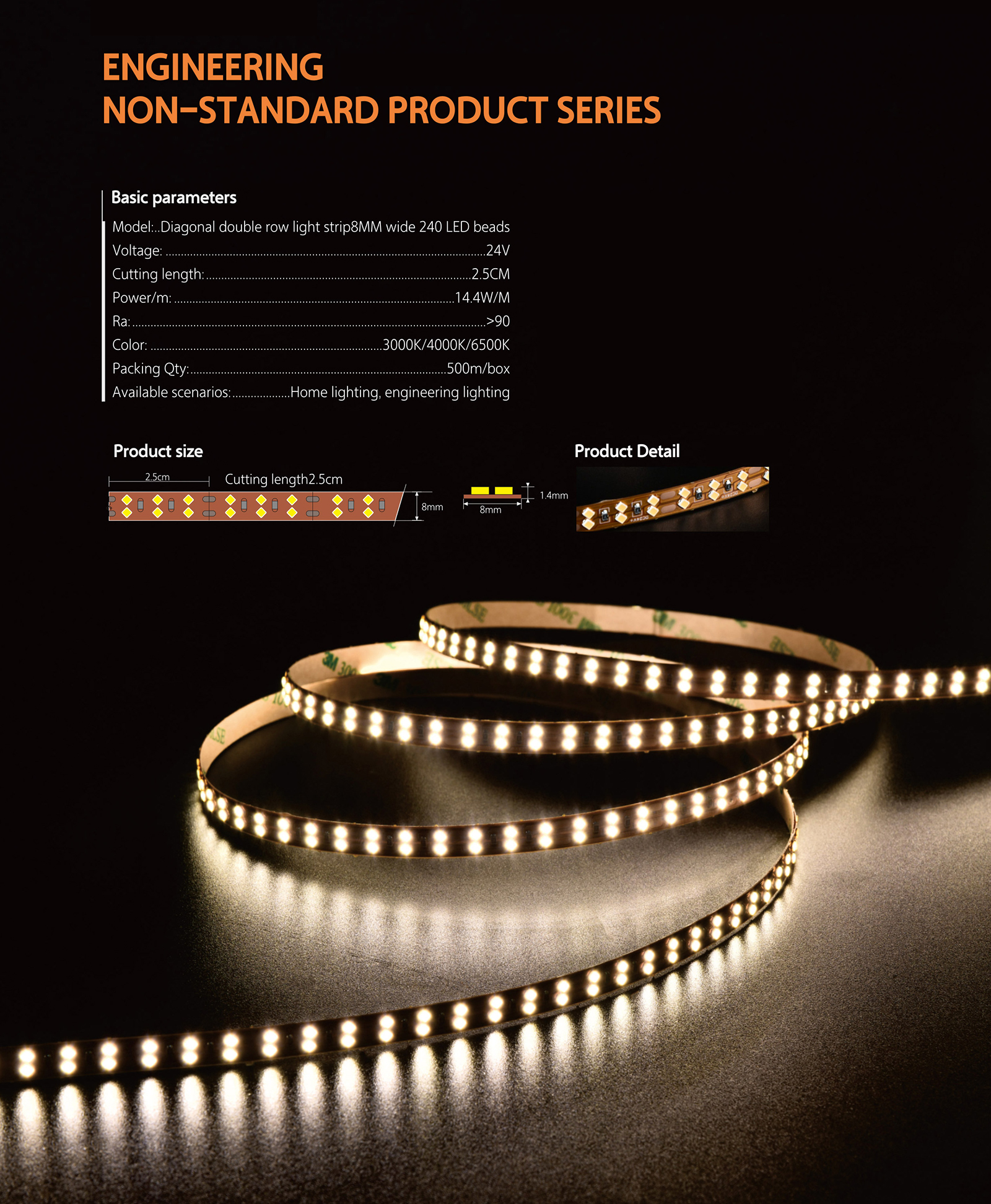 | Model NO. | ZD2835-240P-24V-8MM Diagonal double row light strip | Emitting Color | Warm White/Nature White/White |