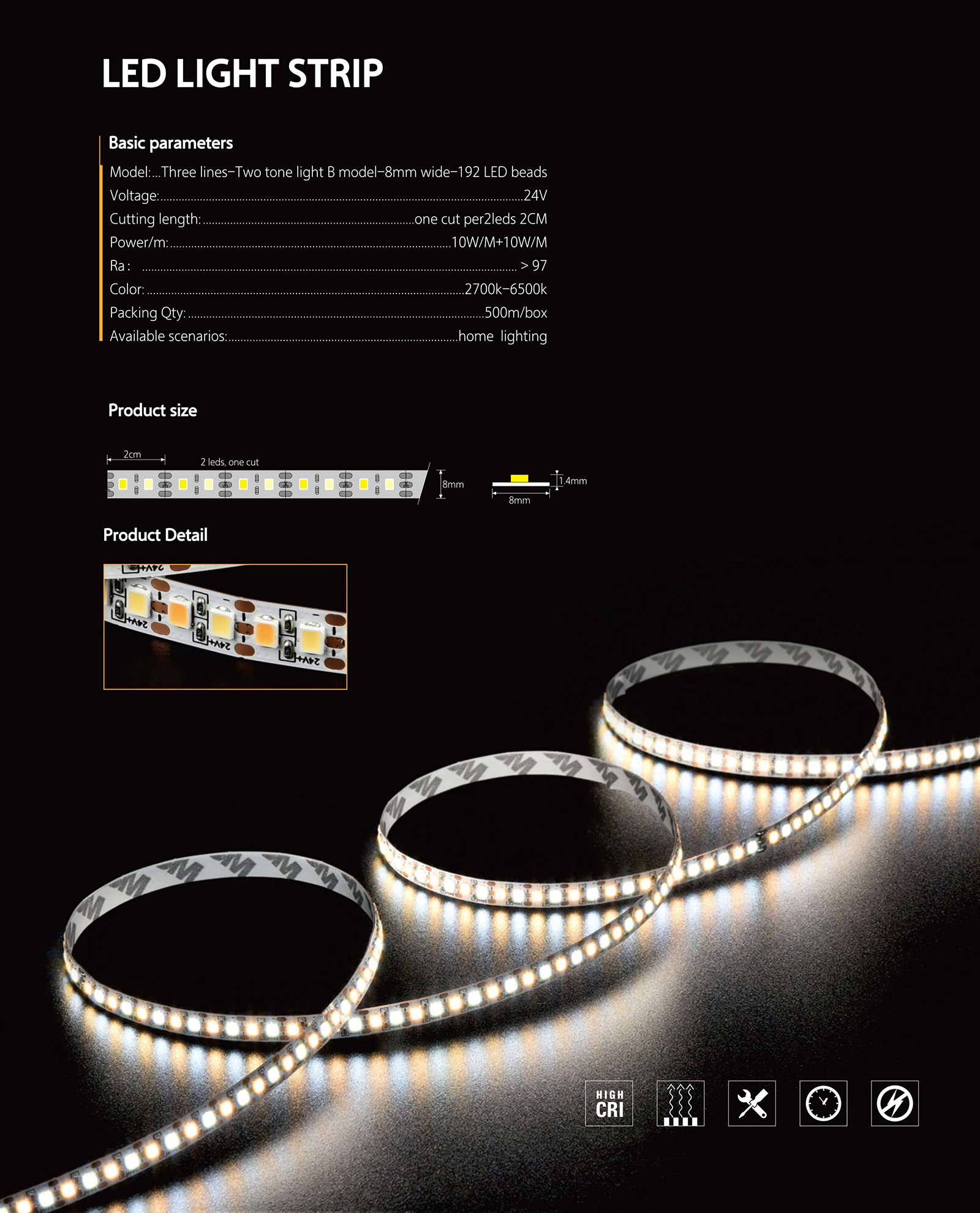 | Package | 10m/Roll | LED Qty | 192LEDs/M |