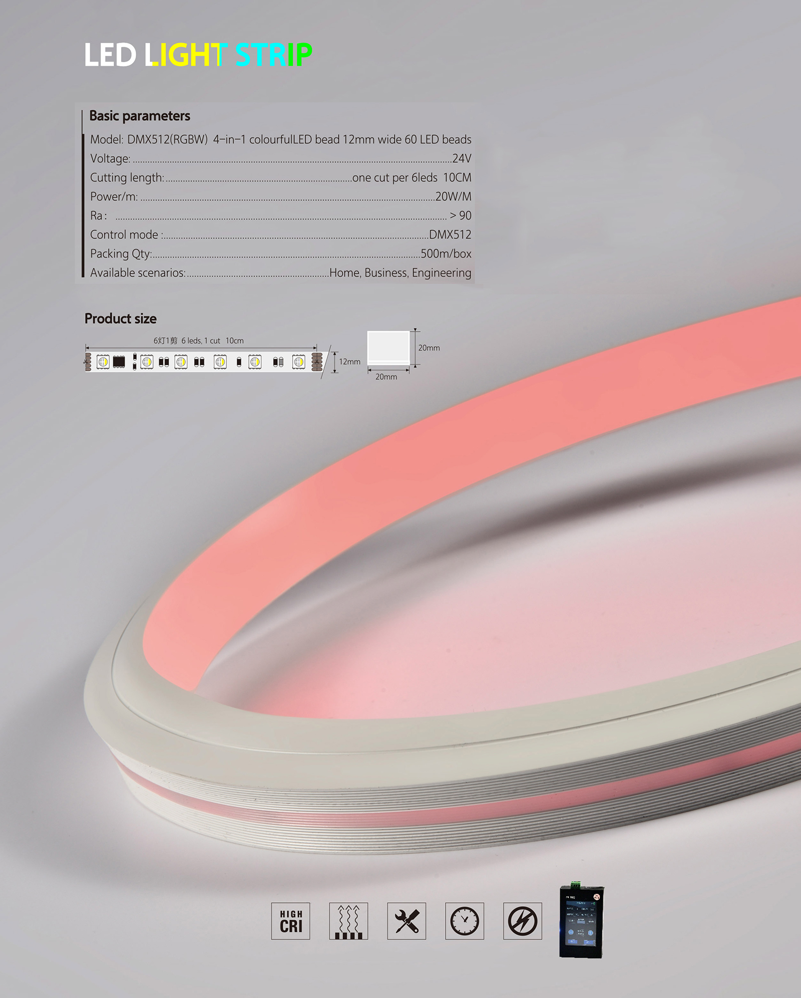 | Model | RGB 4-in-1 LED Bead 12mm Wide 60 LED Beads | Cutting Length | One Cut Per 6 LEDs 10cm |