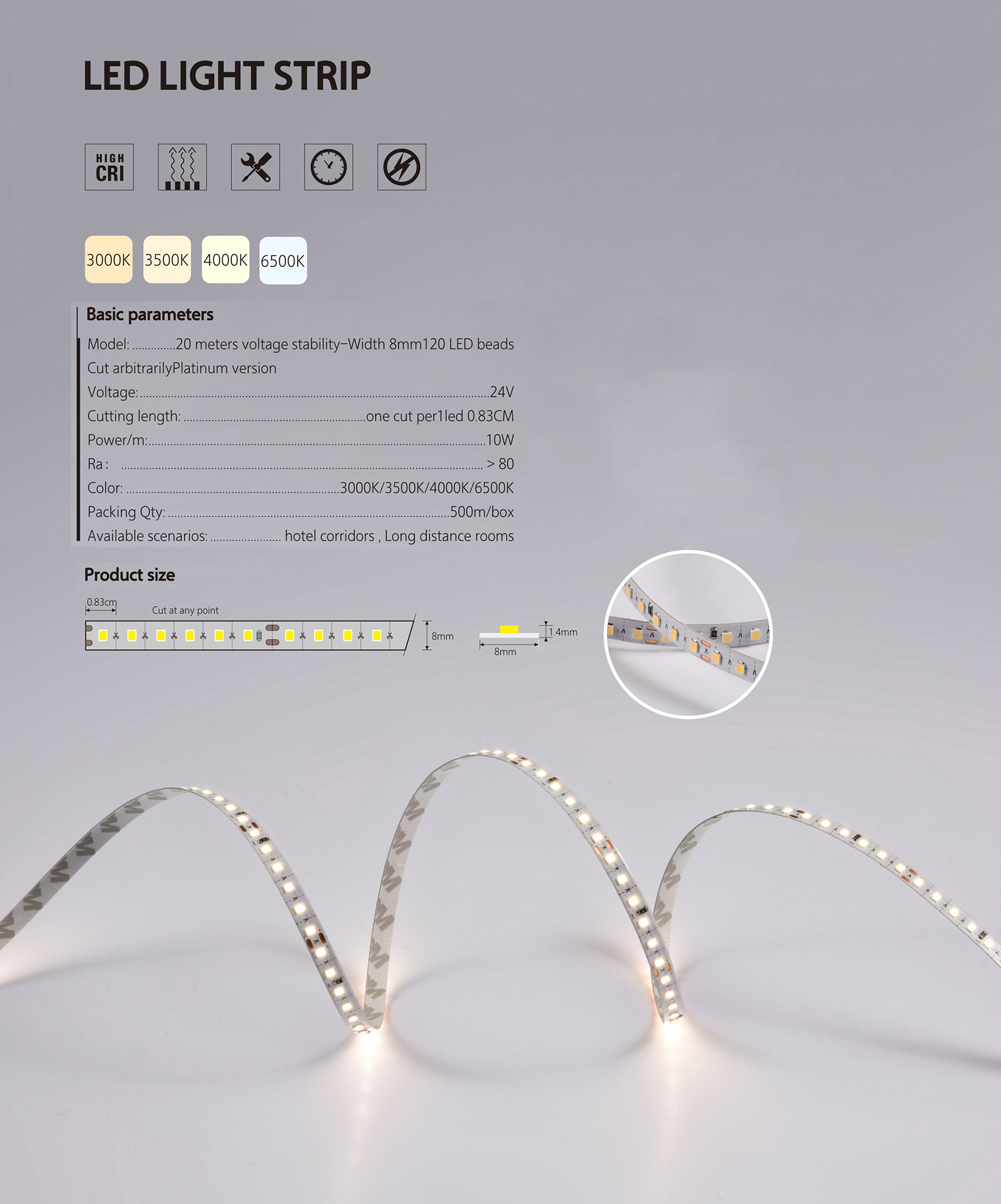 | Model | 8mm Wide 120 LED Beads Colored Light | Cutting Length | One Cut Per 1 LEDs 0.83 cm |